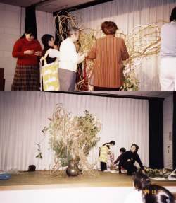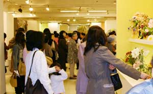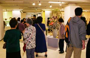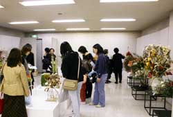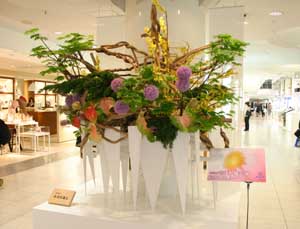 続いて、家元参事の先生方により、パンパス、つつじ、ひまわり、アレカヤシなどの植物が各々の造形空間に配置され完成されました。