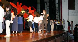 そして、次に5色の構成−客席の会員が参加して、5色の色紙が作品に張付けられていきました。「会員とのコラボレーション、5色ののコラボレーション」、作品が華やかに形創られていきました。